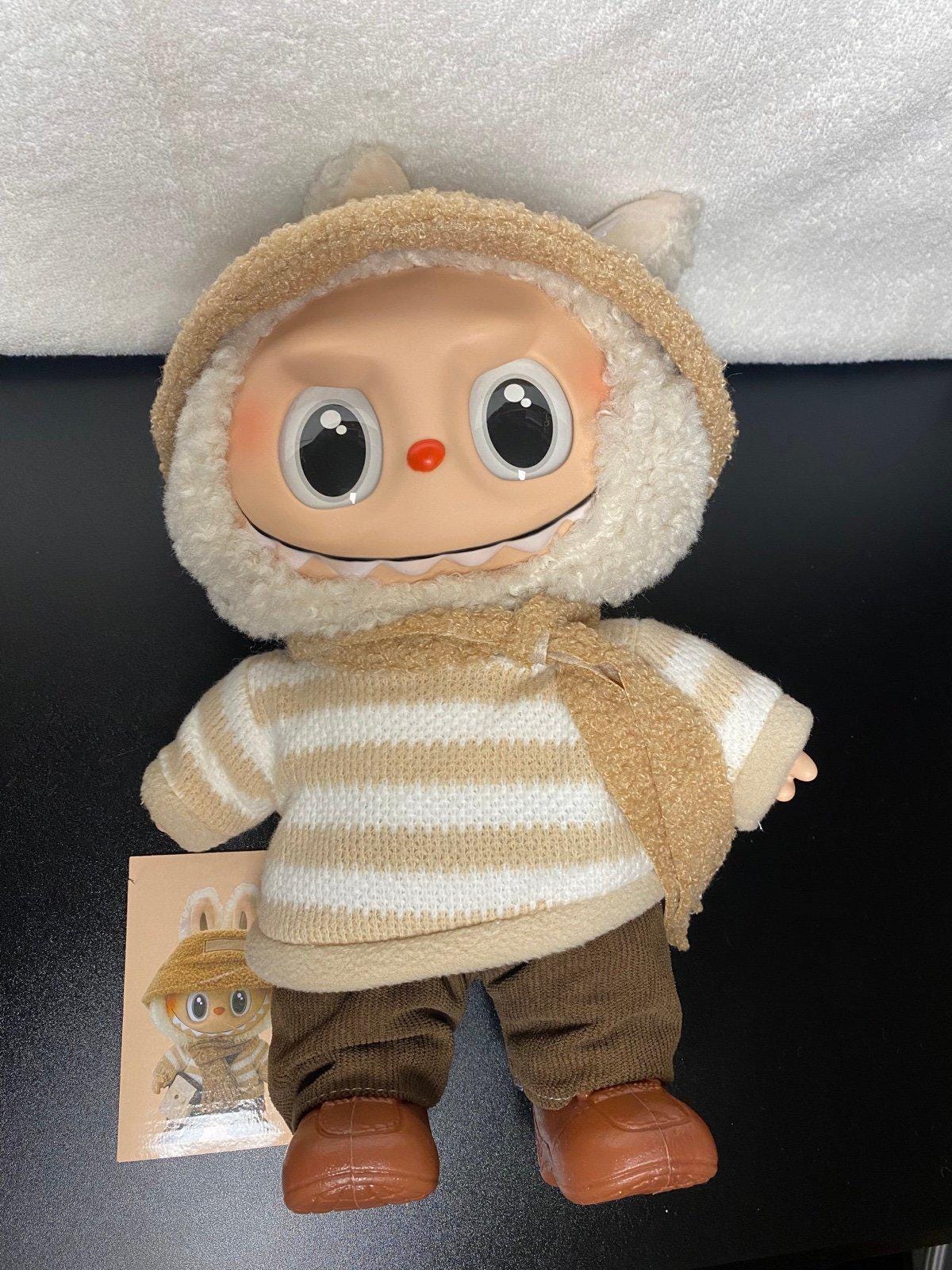 Bring home the charm of the Labubu Bunny Explorer Collectible Figure, a must-have for designer toy lovers and collectors alike. This adorable figure features Labubu dressed in a cozy beige and white striped sweater, soft brown pants, and a warm scarf, complete with a fuzzy bunny-ear hood for a whimsical touch.